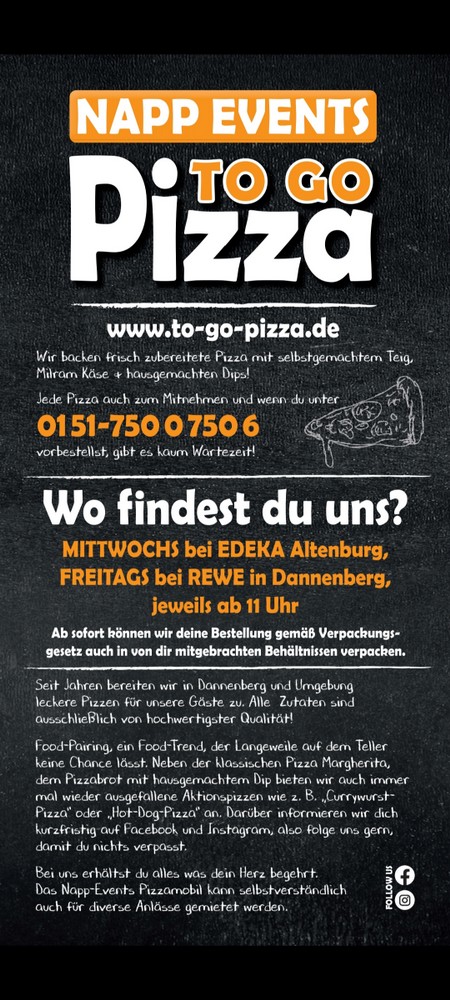 Am Dömitzer Damm 5, 29451 Dannenberg / + 49 151 750 0 750 6 / mail@to-go-pizza.de