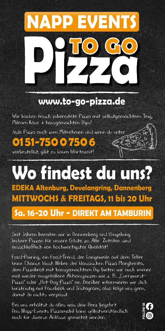 Seit Jahren bereiten wir in Dannenberg und Umgebung leckere Pizzen für unsere Gäste zu. Von der klassischen Pizza Margherita, Pizzabrot mit hausgemachten Dip oder auch mal ausgefallene Currywurst sowie Hot-Dog Pizzen.